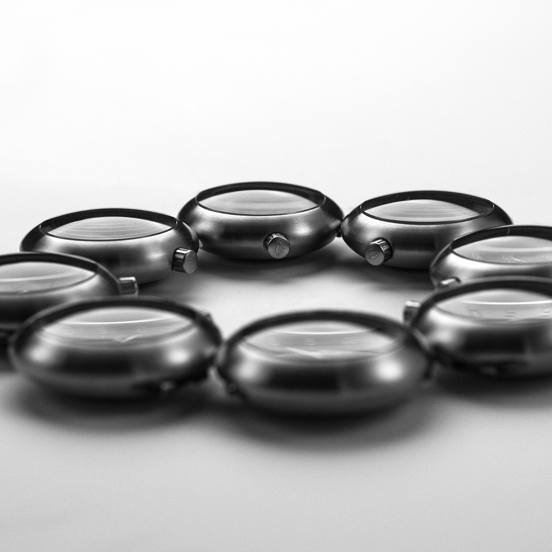 This constitutes the same conceptual gesture as Verner Panton achieving his monoblock chair in 1967: suppressing joints, visible articulations, to create an object seemingly born of a single breath. The rubber strap integrates flush with the case, creating a continuous ellipse from wrist to bezel.
