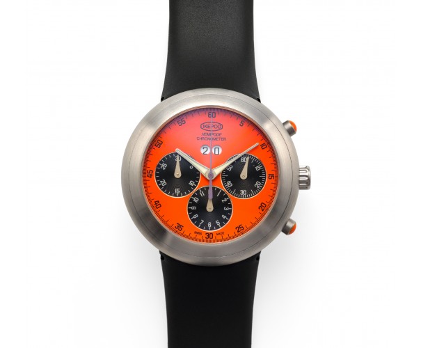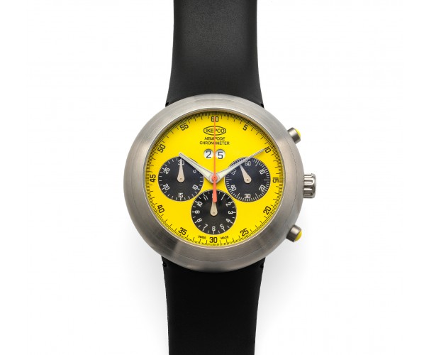 Très beau "full set" d'une Horizon black PVD avec aiguilles blanches. Série réservée pour les VIP et amis de la marque lors du relancement en 2008. Le coffret blanc contient la montre et son écrin, le pochon, les papiers et un magnifique look book / catalogue avec les photos de modèles gen2 et les mood board de Marc Newson